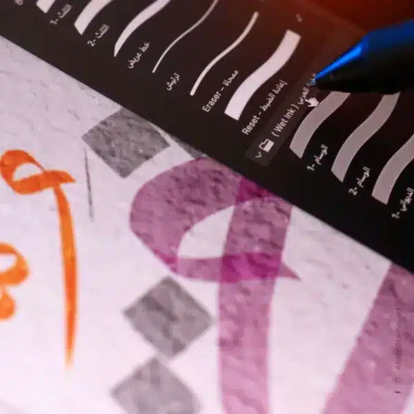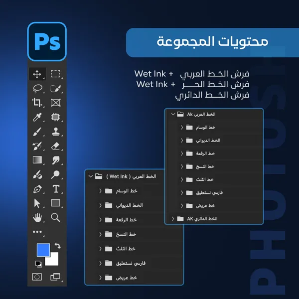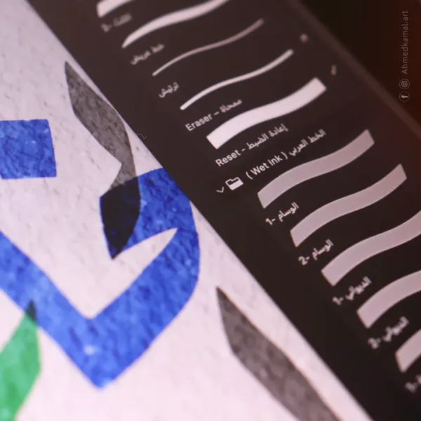 تتكون الباقة من مجموعة فرش رقمية مقسمة إلى مجلدات تشمل جميع الخطوط العربيه كما تحتوي على مجلدات إضافية لفرش الحبر الرطب (Wet Ink) والخط الدائري صُممت هذه الأقسام لتوفير الأدوات المناسبة لكل نوع من أنواع الخط العربي